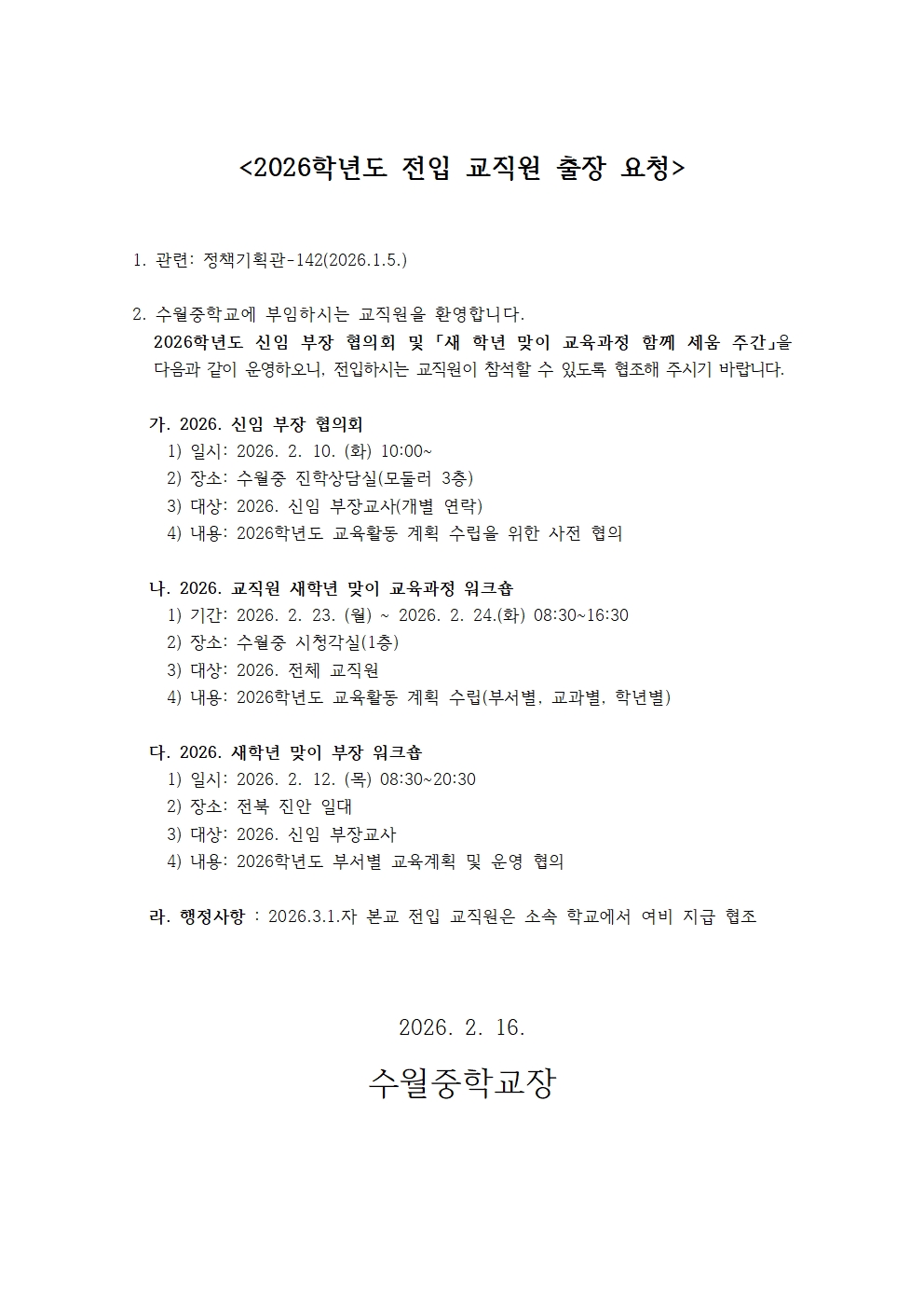 2026학년도 전입 교직원 출장 요청