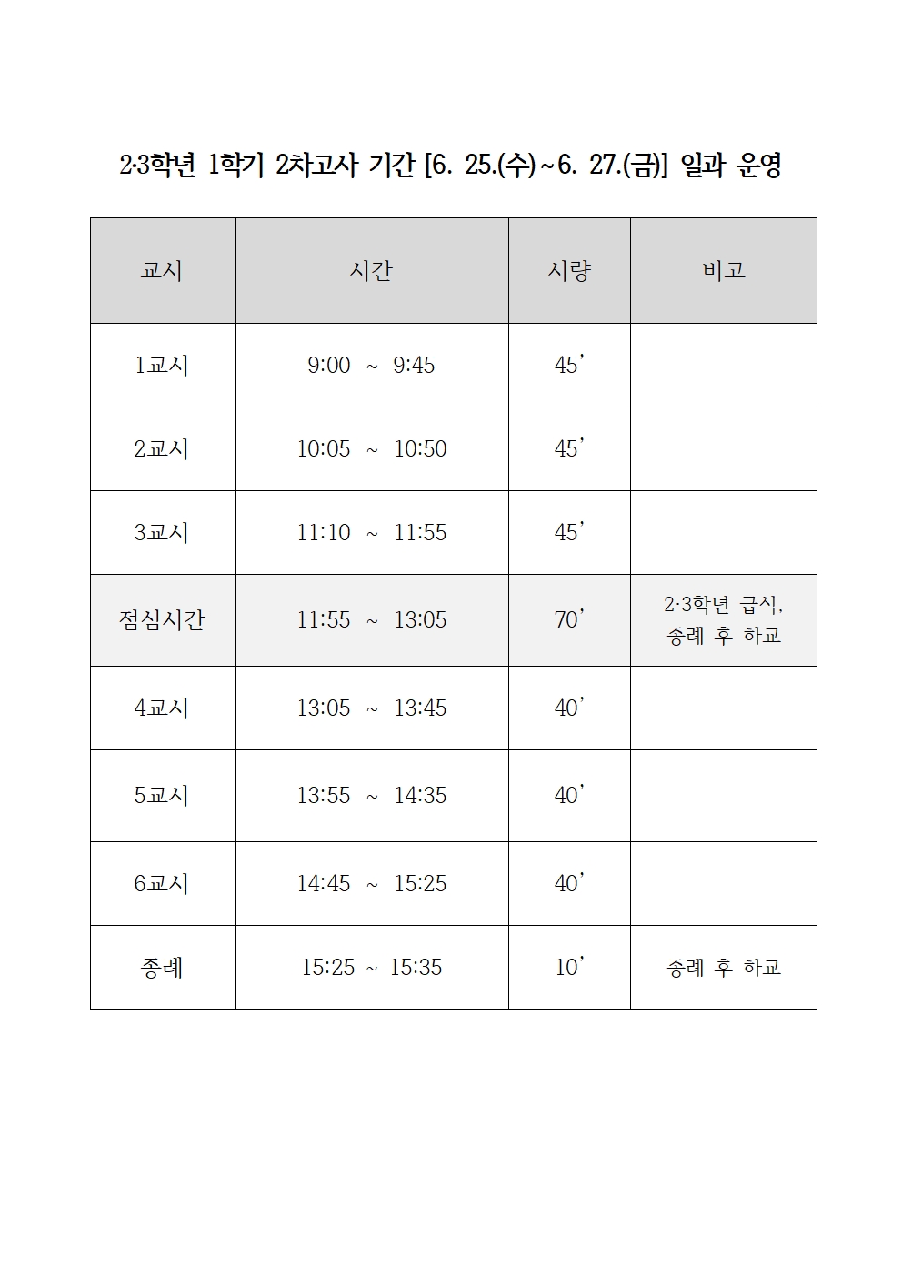 1학기 2차고사 기간(6/25수 ~ 6/27금) 일과조정 안내