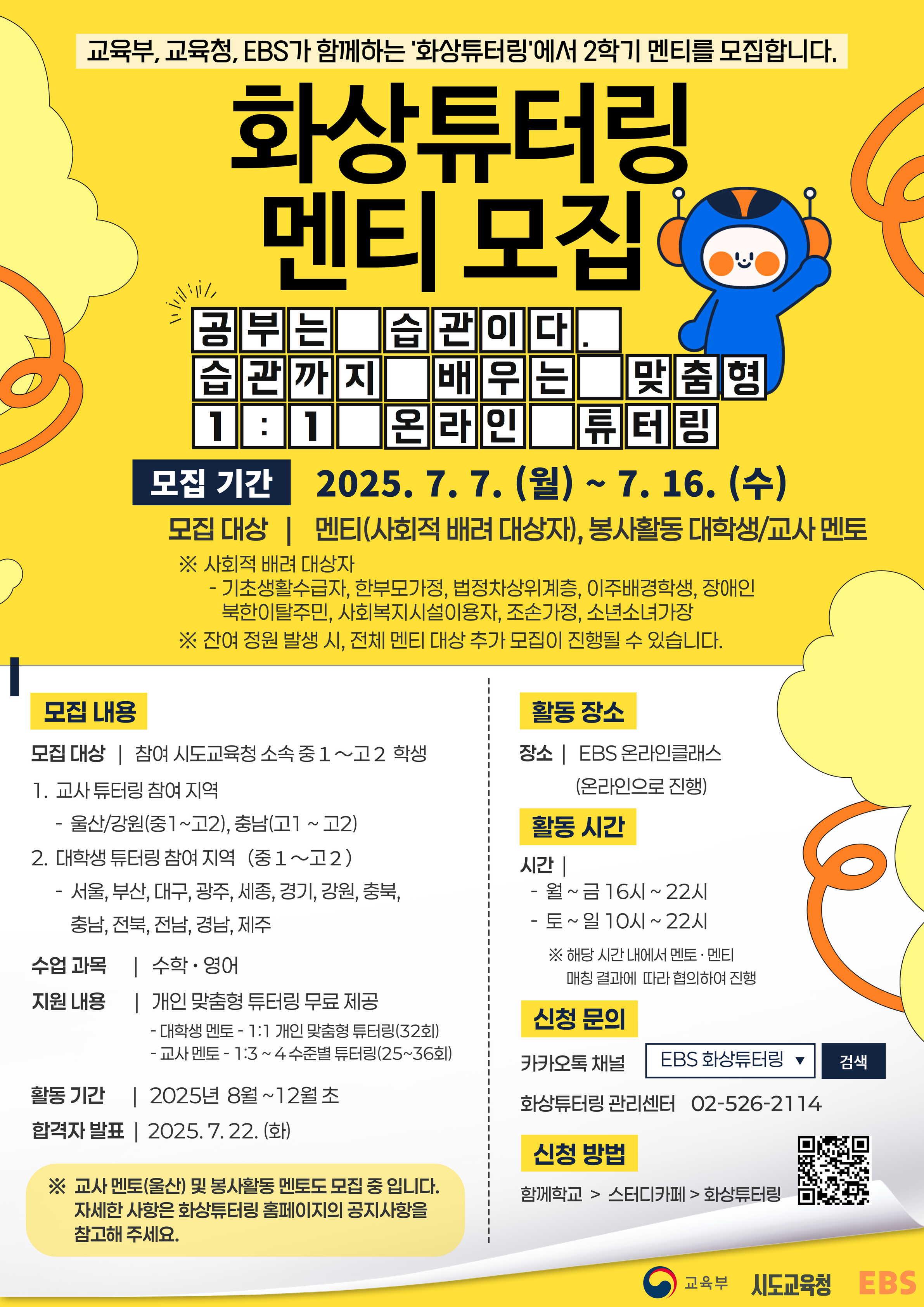2025년 EBS 화상튜터링 사업 2학기 멘티학생 모집 안내