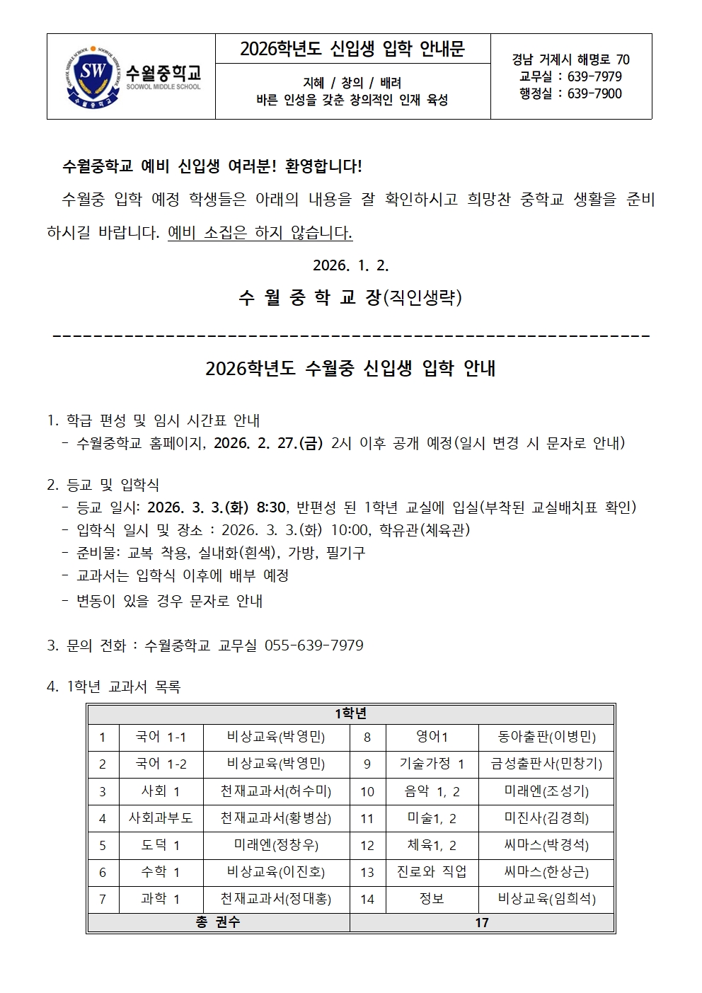2026학년도 수월중학교 신입생 입학 안내